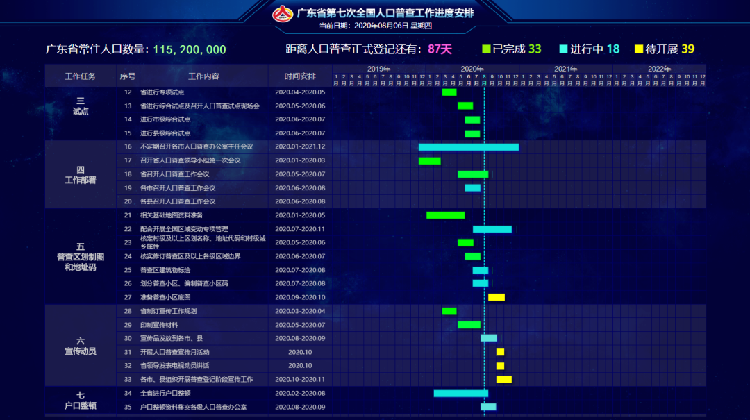 全省七人普“挂图作战”进度图分为19个大项、90个小项工作任务,显示屏可以实时、直观、快速地反映全省和各地人口普查工作阶段性工作情况,方便对表对标,形成倒逼机制,及时推进普查各阶段工作。